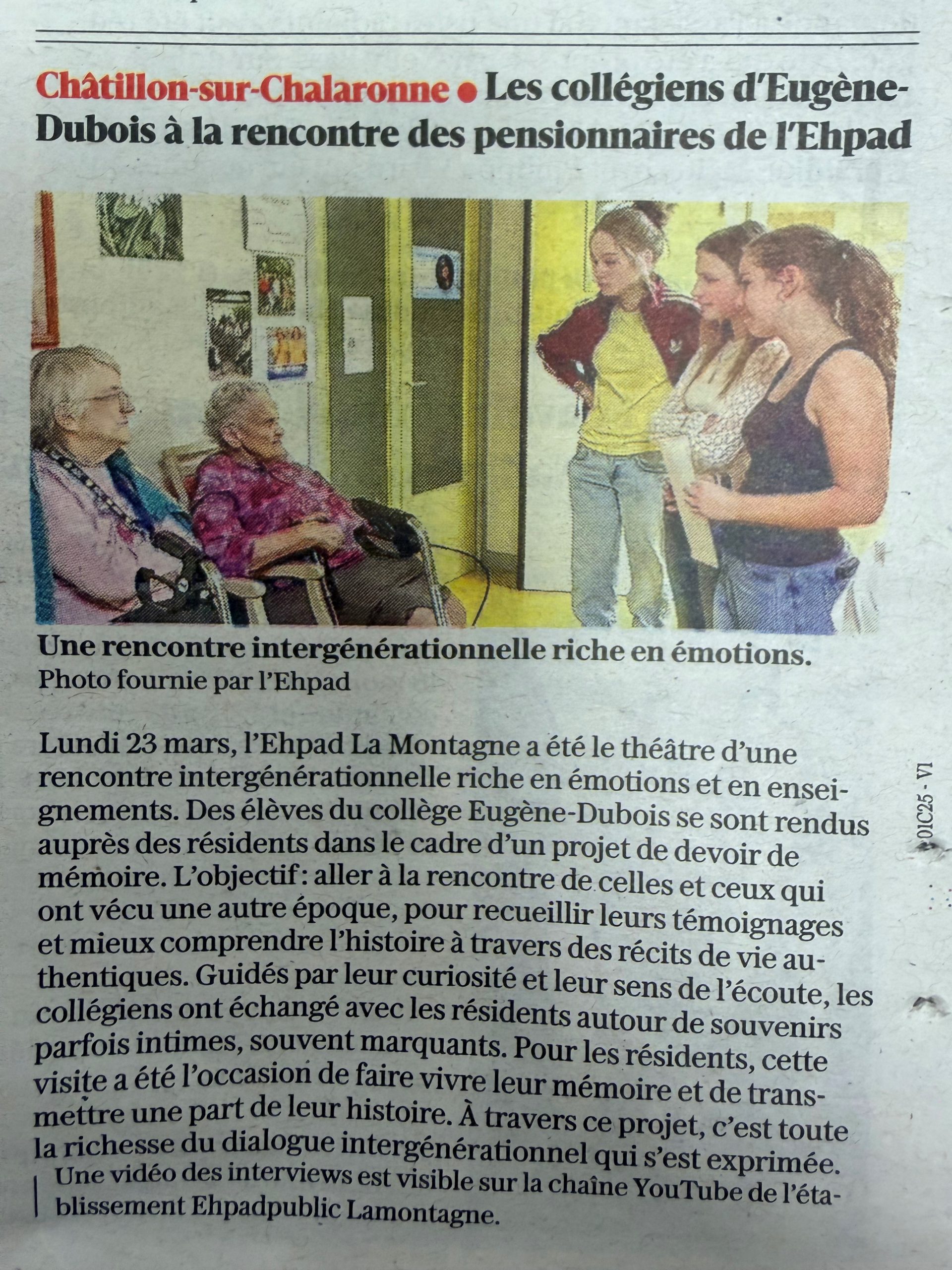 Le lundi 23 mars, au sein de l’EHPAD, les élèves du collège Eugène Dubois sont venus à la rencontre des résidents.