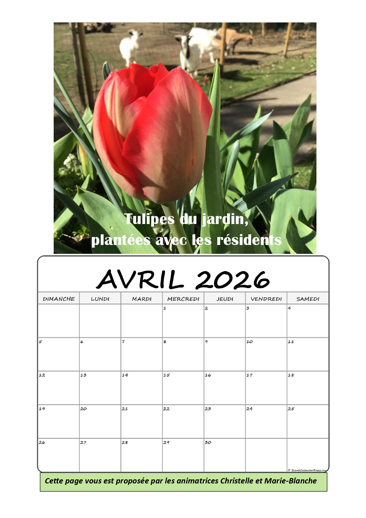 Retour Actualités Le calendrier 2026 Une page de calendrier est conçue et proposée tous les mois à chaque résident par les animatrices Christelle et Marie-Blanche. Les photos choisies, sont prises dans le parc de l’EHPAD ou à proximité. Voici les 4 premiers mois. L'actualité en images...